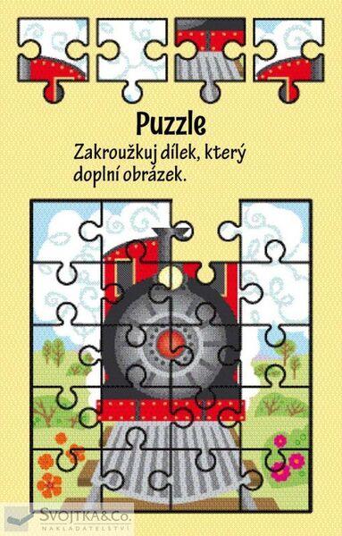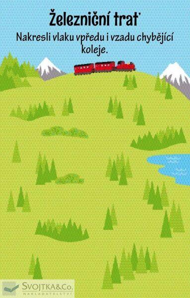 Nakresli bandity, kteří přepadli vlak a cestující. Spočítej, kolik kroužků dokážeš najít na obrázku. Sleduj zamotané koleje a zjisti, který vlak vyjel z nádraží. Dokresli druhou půlku vlaku a strojvůdci domaluj vlasy, oči, nos a pusu. Přiřaď zavazadla k jejich majitelům.