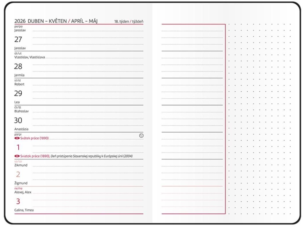Objevte spojení stylu a praktičnosti s naším 18měsíčním diářem! Elegantní barevná obálka s parciálním lakem upoutá na první pohled, zatímco praktická stužka a gumička udrží vaše plány pod kontrolou. Mějte své cíle a úkoly vždy po ruce – ať jste kdekoli. Perfektní společník na více než rok, který vnese do každého dne inspiraci a řád.