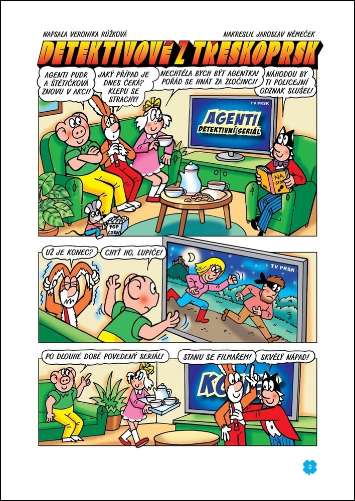 Nová komiksová kniha z oblíbené edice čtyř příběhů přináší další dobrodružství veselé party ze Čtyřlístku. Fifinka, Bobík, Pinďa a Myšpulín v ní zažijí příběhy tentokrát na filmové téma. V prvním příběhu s názvem Detektivové z Třeskoprsk se naši hrdinové rozhodnou natočit vlastní detektivní seriál. Hlavní roli zde sehraje Fifinka, které se shodou náhod podaří objasnit skutečnou krádež v chovatelských potřebách. I když pachatel bude nakonec docela nečekaný.