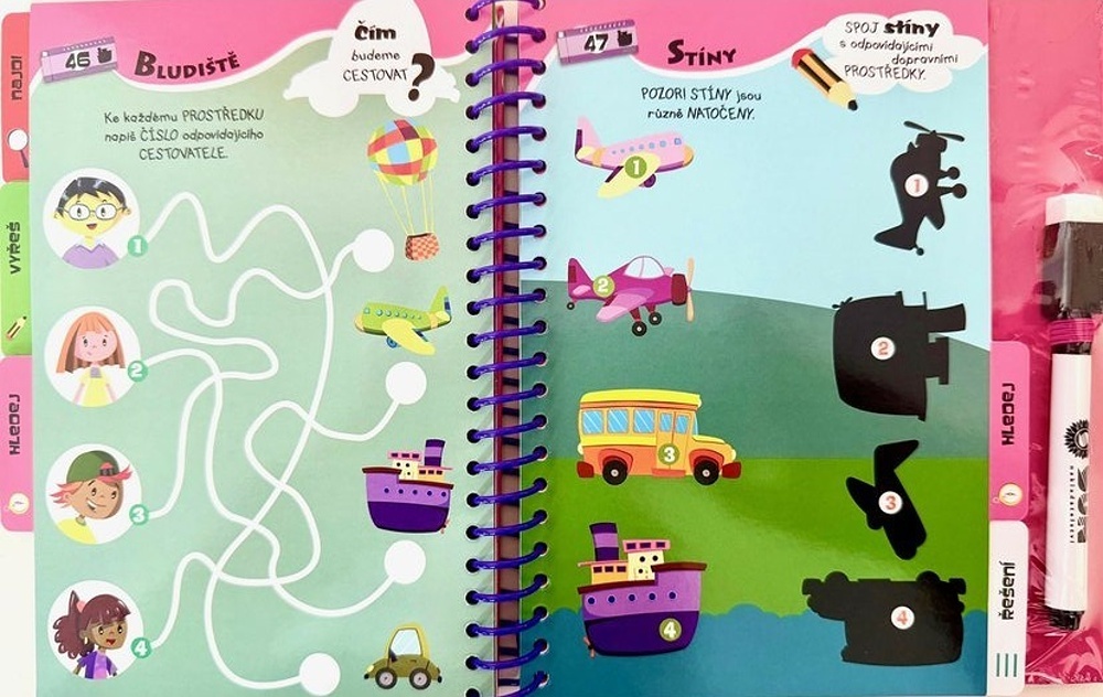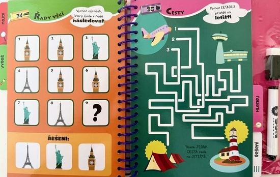 Přiložené mazací pero umožňuje opravy: je v pořádku, když se vám to nepodaří napoprvé, značky lze snadno vymazat a zvolit nový přístup, postup. Tento formát poskytuje přirozený rámec pro sebekontrolu a budování sebevědomí: děti zažívají, že dělání chyb je součástí procesu učení a že náprava je hmatatelná. Délka trvání stránek s úkoly je flexibilní: některé lze vyřešit za minutu nebo dvě a existují hádanky, které vyžadují hlubší soustředění.