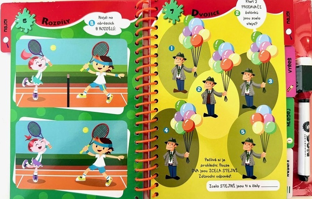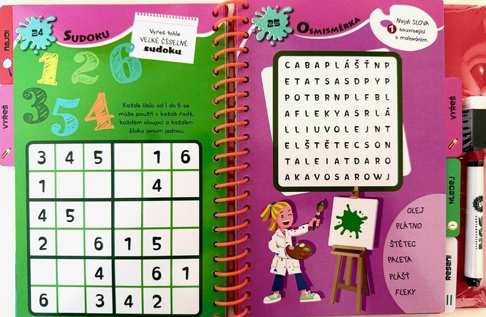Přiložené mazací pero umožňuje opravy: je v pořádku, když se vám to nepodaří napoprvé, značky lze snadno vymazat a zvolit nový přístup, postup. Tento formát poskytuje přirozený rámec pro sebekontrolu a budování sebevědomí: děti zažívají, že dělání chyb je součástí procesu učení a že náprava je hmatatelná. Délka trvání stránek s úkoly je flexibilní: některé lze vyřešit za minutu nebo dvě a existují hádanky, které vyžadují hlubší soustředění.