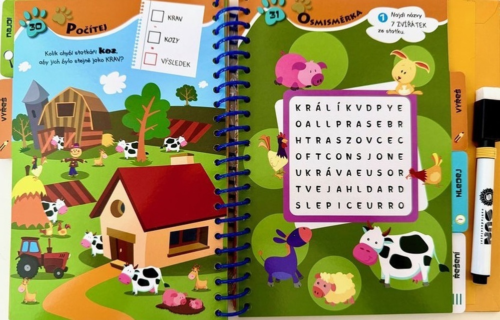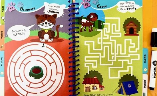 Přiložené mazací pero umožňuje opravy: je v pořádku, když se vám to nepodaří napoprvé, značky lze snadno vymazat a zvolit nový přístup, postup. Tento formát poskytuje přirozený rámec pro sebekontrolu a budování sebevědomí: děti zažívají, že dělání chyb je součástí procesu učení a že náprava je hmatatelná. Délka trvání stránek s úkoly je flexibilní: některé lze vyřešit za minutu nebo dvě a existují hádanky, které vyžadují hlubší soustředění.
