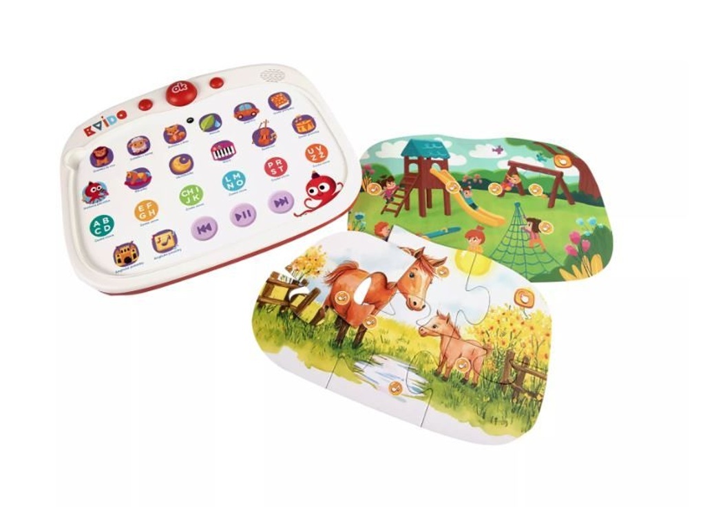 Mluvicí tablík - Kvído obsahuje: dotykovou tabulku – Mluvicí tablík, 2 oboustranné puzzle (4 motivy s dopravními prostředky a zvířátky z farmy s ozvučenými obrázky a kvízy), 2 oboustranné ozvučené karty (4 obrázky s motivy dětského hřiště, pískoviště a české pohádky O Koblížkovi se zvuky a kvízy), adaptér na stahování dalších zvukových souborů.