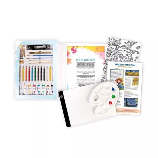 Seznam se a inspiruj se 13 významnými světovými malíři, jakými byli Vincent van Gogh, Claude Monet, Frida Kahlo nebo Andy Warhol. Vyzkoušej si různé postupy a techniky krok za krokem díky jednoduchým návodům. Vytvoř si galerii svých obrázků inspirovaných malířskými velikány! Sada obsahuje štětce, barvy, pastelky a vše ostatní, co budeš k tvorbě potřebovat. Součástí je svíticí LED tabulka, díky které budeš malovat jako opravdický mistr!