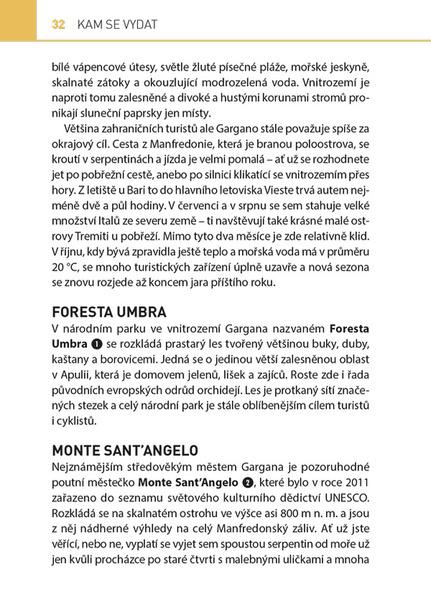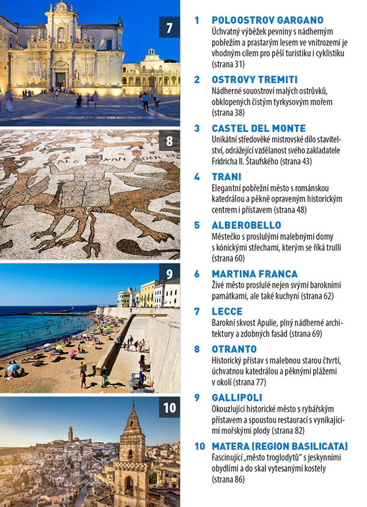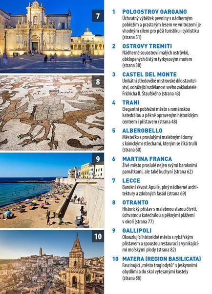 Nechte se inspirovat bezpočtem krásných míst, která přímo vybízejí k návštěvě. V úvodu knihy najdete tři itineráře: první vás během osmi dní provede celou Apulií. Díky druhému itineráři prozkoumáte krásné písečné pláže v Otrantu. A třetí vám představí kulinářské speciality města Salento.