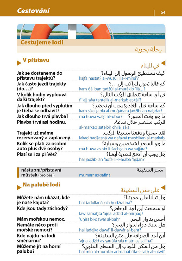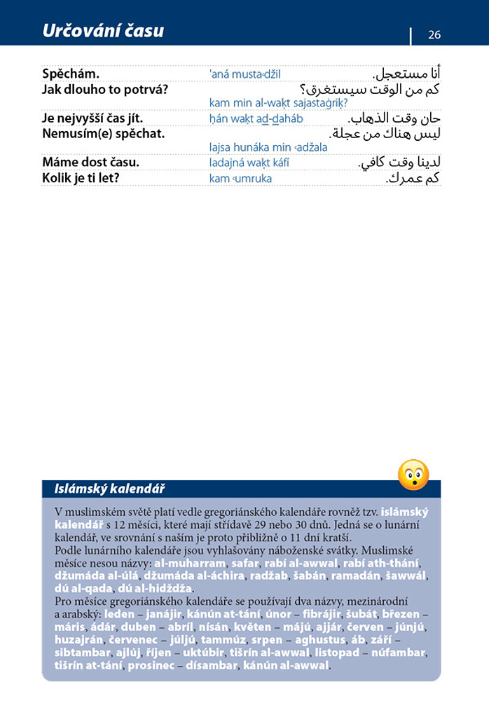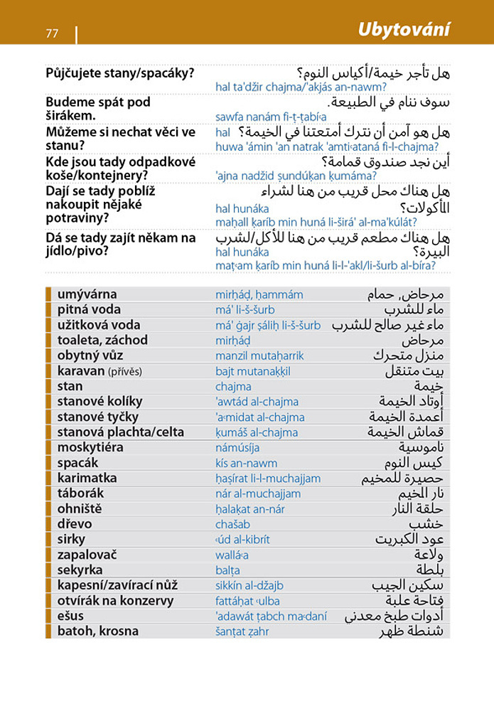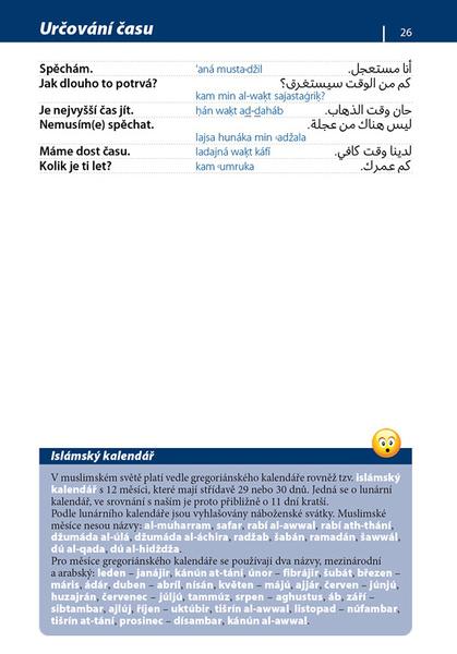 Arabské krajiny voní sluncem, kávou a tabákem, ozývá se tu překřikování prodavačů přerušované voláním muezínů a na nás působí trochu jako fata morgána. Exotiku podtrhuje i arabský jazyk, který v písemné podobě připomíná spíš rozsypaný čaj a který naše uši vnímají jako směs těžko srozumitelných zvuků. Teď si ale můžete na cestu přibalit naši konverzaci, která vám pomůže otevřít mnohé dveře i srdce. Součástí knihy je oboustranný arabský slovníček a přehled gramatiky.