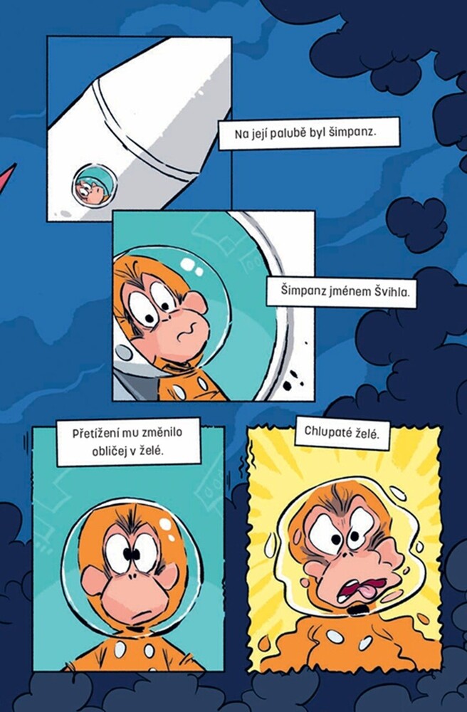 David Walliams rád mění žánry svých knih a vždy je koření notnou dávkou humoru, už vyzkoušel fantasy i sci-fi, měli jsme tu také válečné drama a špionážní román po walliamsovsku – a teď se pustil do komiksu. Jeho hrdinou je tentokrát... šimpanz! Pravda, není to zrovna chytrolín a koumák, ba dalo by se říct, že je to trouba. Vydává neslušné zvuky (radši se neptejte, z kterých tělních otvorů), šťourá se v nose a z banánů nejí tu mňamózní část uvnitř, ale pochutnává si na slupkách!