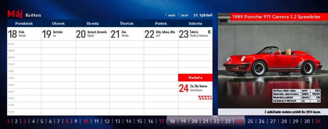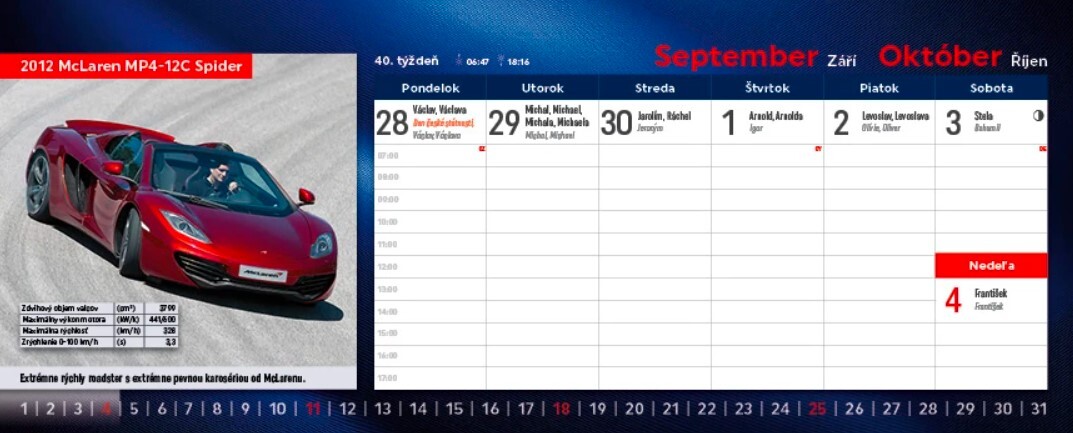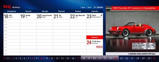 Obľúbený titul Autá, tentokrát s témou "dizajnérske ikony", predstavuje modely áut, ktoré určovali trendy alebo vytvorili neopakovateľné unikáty. Mnohé môžeme dnes už obdivovať len na fotografiách. Stolový kalendár s riadkovaným kalendáriom obsahuje aj slovenské aj české mená (plus netradičné mená), fázy Mesiaca, východy a západy Slnka, mesačné kalendáriá a štátne sviatky všetkých krajín EÚ.