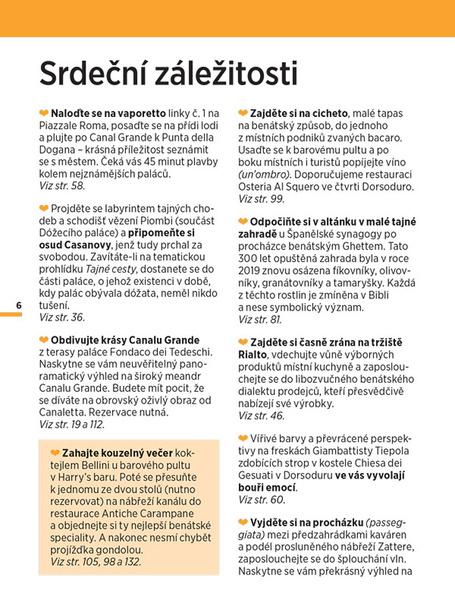 Náš průvodce představí hlavní srdeční záležitosti. Kromě popisu památek v průvodci najdete řadu zajímavostí, například o malířství, dějinách a umění, laguně a životě na vodě nebo o maskách a karnevalech.