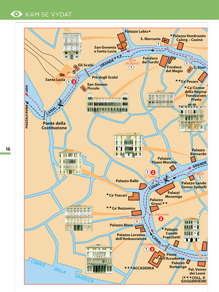 S orientací po městě vám pomohou plánky jednotlivých čtvrtí, doporučená místa jsou označena na mapkách čtvrtí barevnými terčíky s číslem. Červeně uvedené souřadnice (např. C2) odkazují na rozkládací mapu Benátek (vloženou vzadu v průvodci).