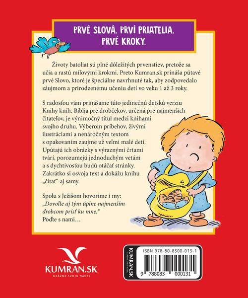 S radosťou vám prinášame túto jedinečnú detskú verziu Knihy kníh. Biblia pre drobčekov, určená pre najmenších čitateľov, je výnimočný titul medzi knihami svojho druhu. Výberom príbehov, živými ilustráciami a nenáročným textom s opakovaním zaujme už veľmi malé deti. Upútajú ich obrázky s výraznými črtami tvárí, porozumejú jednoduchým vetám a s dychtivosťou budú otáčať stránky. Zakrátko si osvoja text a dokážu knihu „čítať“ aj samy.