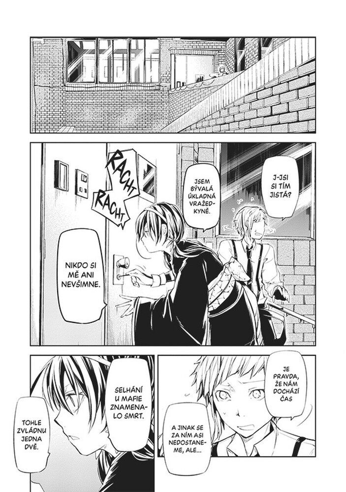 Kjóka s Acušim vyrážejí řešit svoji první zakázku. Zničehonic na ně ovšem za bílého dne útočí Kjóčina bývalá šéfka Kójó Ozaki, která chce uprchlici odvést zpátky k mafii. Zvláštní detektivní kancelář se už dál nedokáže vyhýbat otevřenému konfliktu s mafií ani Cechem, takže se přesouvá do jiných prostor a připravuje se na boj.