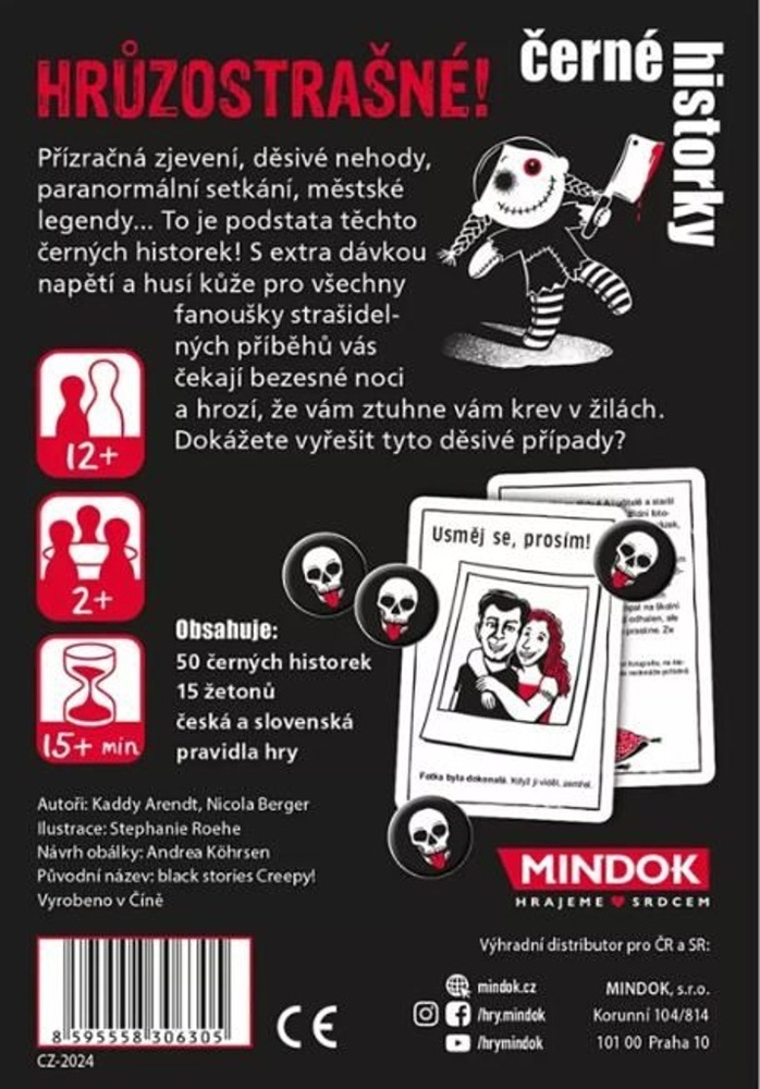 Hra Černé historky: Hrůzostrašné! obsahuje: 50 černých historek, 15 žetonů, česká a slovenská pravidla hry.