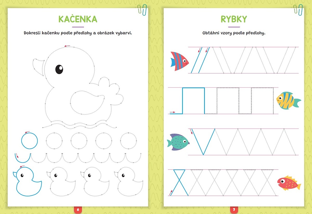 Než dítě začne psát první písmena, je důležitý trénink uvolnění ruky. K tomu slouží uvolňovací cviky. Obtahováním podle předlohy si děti zlepšují přesnost při psaní, vybarvováním a dokreslováním obrázků se učí vybírat barvy.