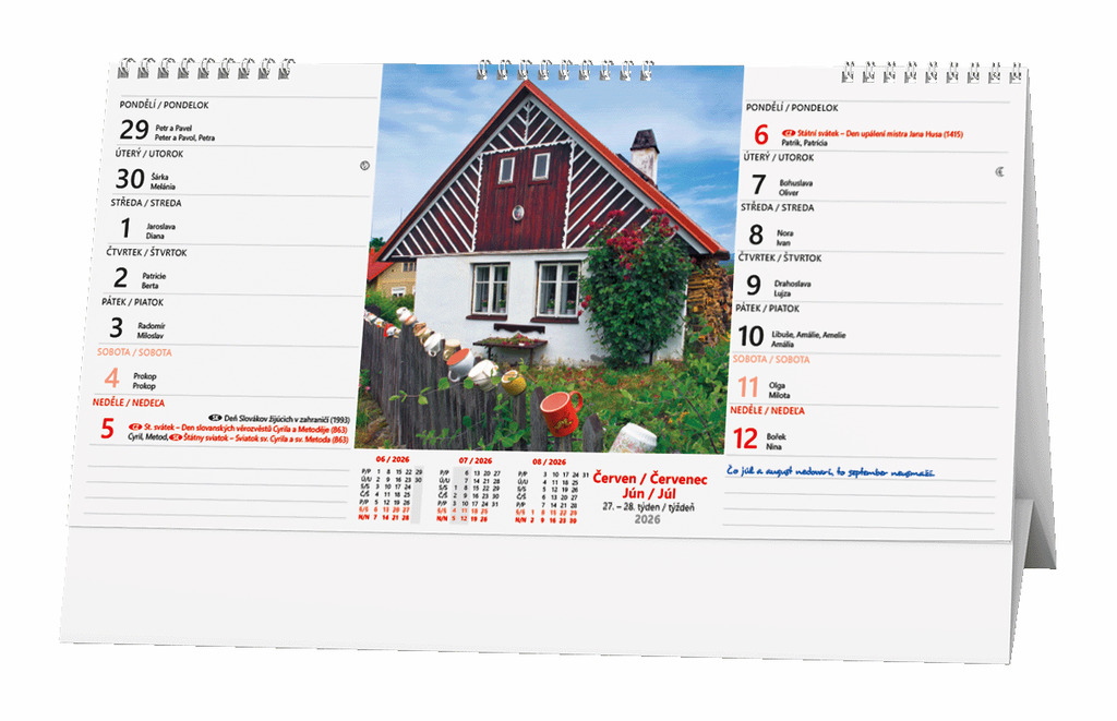 Stolní kalendář se čtrnáctidenním kalendáriem, s obrázky chalup a pranostikami.