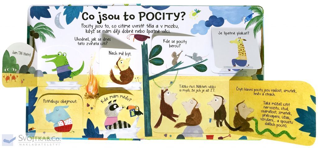 Pocity jsou to, co cítíme uvnitř těla a v mozku, když se nám dějí dobré nebo špatné věci. Děti se odjakživa ptají, zda jsou pocity "naše", nebo zda nám tak úplně nepatří, když jako ve vlnách přicházejí a zase odcházejí. Jinak řečeno: co to pocity jsou a kde se berou? Na tyto otázky nemají dospělí vždy rychlou a jasnou odpověď. V této mile ilustrované knížce najdou děti i jejich rodiče odpovědi na nejčastější otázky o pocitech. Proč jsme šťastní? Proč se zlobíme? Z čeho máme strach? Je v pořádku chtít být chvíli sám? Jak se s nežádoucími pocity vypořádat? Odpovědi pod odklápěcími okénky a sympatická zvířata v ilustracích dětem pomohou lépe pochopit komplikovaný svět emocí.