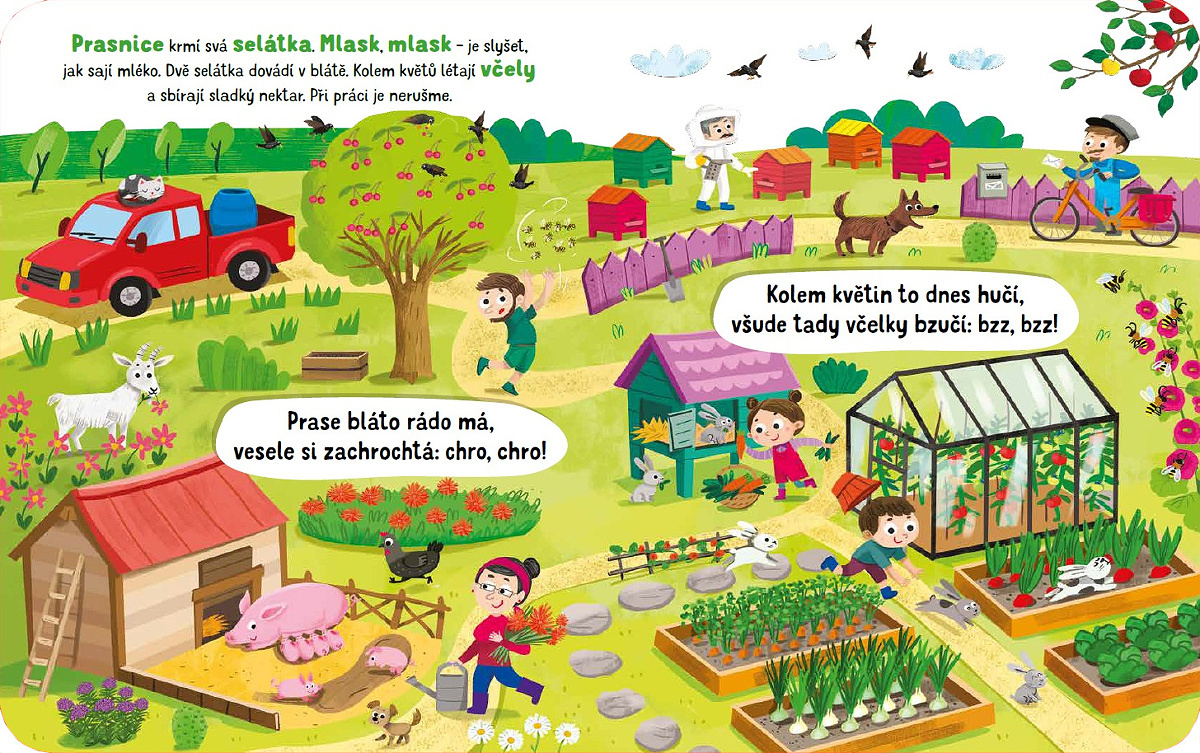 Děti rády objevují svět okolo sebe a využívají k tomu všechny své smysly. Kniha se zvukovými tlačítky a barevnými ilustracemi je seznamuje s životem na venkově. Děti se zábavnou formou učí poznávat zvířata a činnosti, opakováním říkanek a napodobováním zvuků rozvíjejí sluch a paměť.