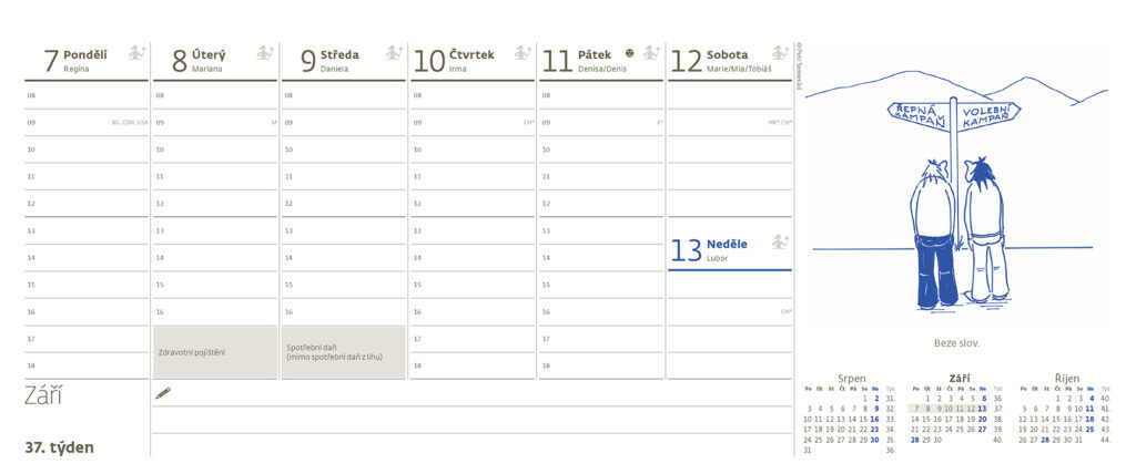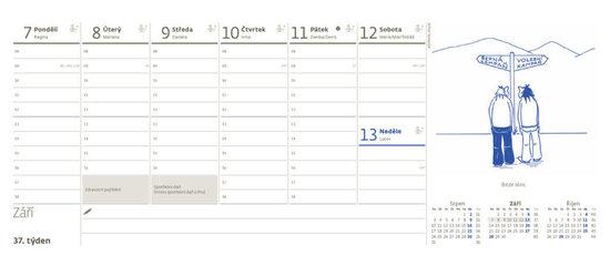 Formát kalendáře: 32,1 x 13,4 cm </br> Kalendárium: české týdenní sloupcové </br> Počet stran kalendáře: 60 + 2 </br> Stojánek: se zámkem </br> Prostor pro přítisk: 32,1 x 3,5 cm </br> + daně,roční období, znamení zvěrokruhu, 3měsíční přehled, EU svátky </br> + s kresbami Petra Semeráda
