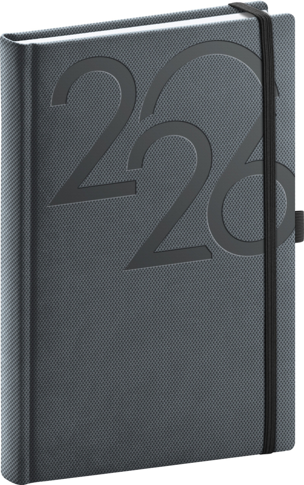 Denní diář Ajax 2026 v černé barvě. Jemně strukturovaný povrch s atypickým reliéfem je vhodný pro všechny typy ražeb. Diář má zakulacené rohy, poutko na tužku a elastickou gumičku. Denní rozvrh s česko-slovenským kalendáriem a doplňkovou angličtinou, němčinou, maďarštinou a ruštinou.