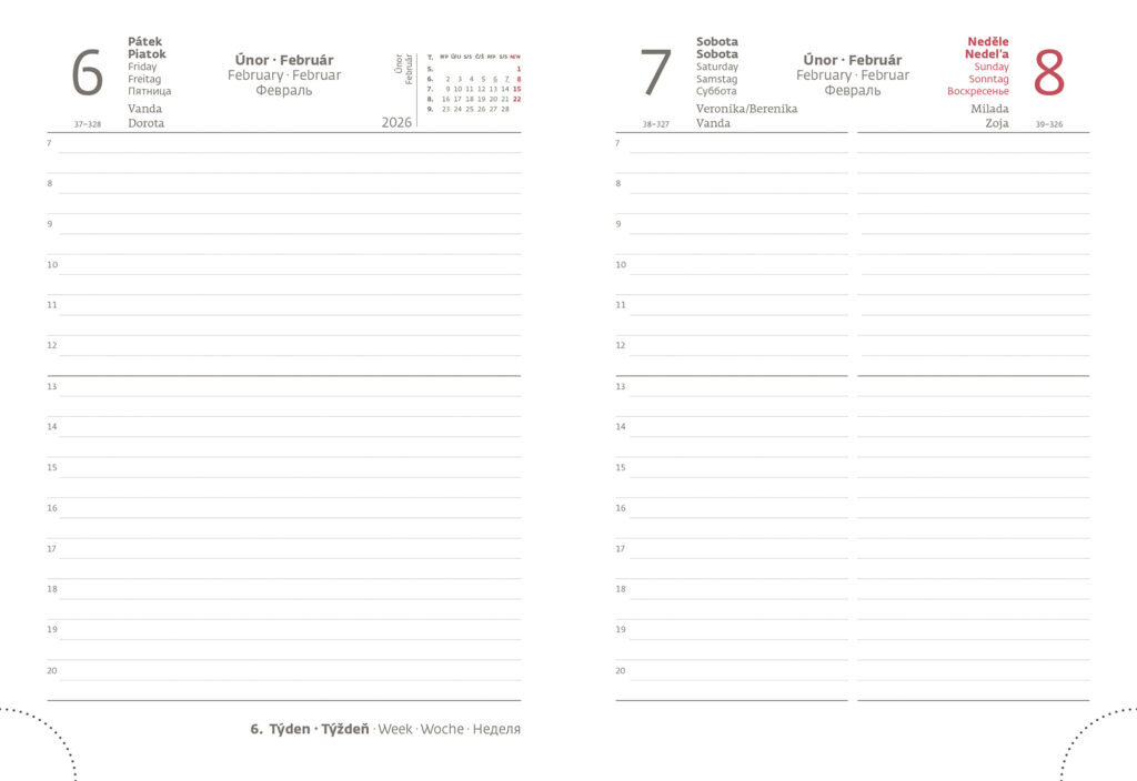 Formát diáře: 120 x 165 mm Rozsah diáře: 336 stran Kalendárium: denní