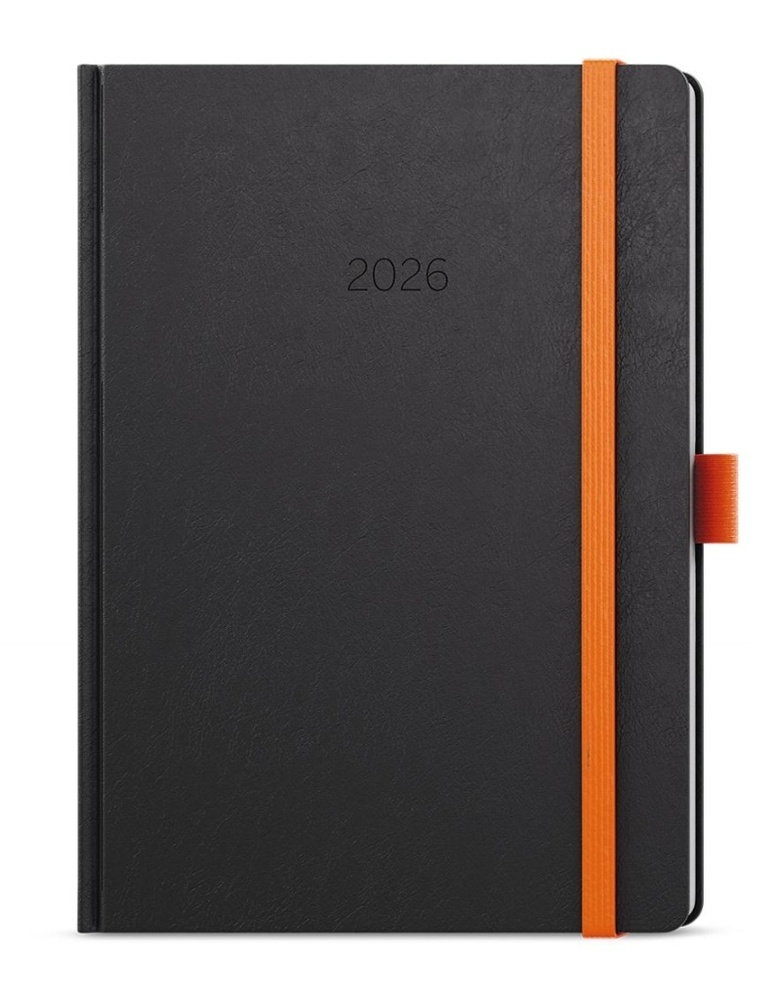 Neobyčejný denní diář s matným povrchem ze strukturovaného materiálu s oranžovou gumičkou a poutkem. Je vyráběný ve formátu A5, má velký prostor pro poznámky a plánování.
