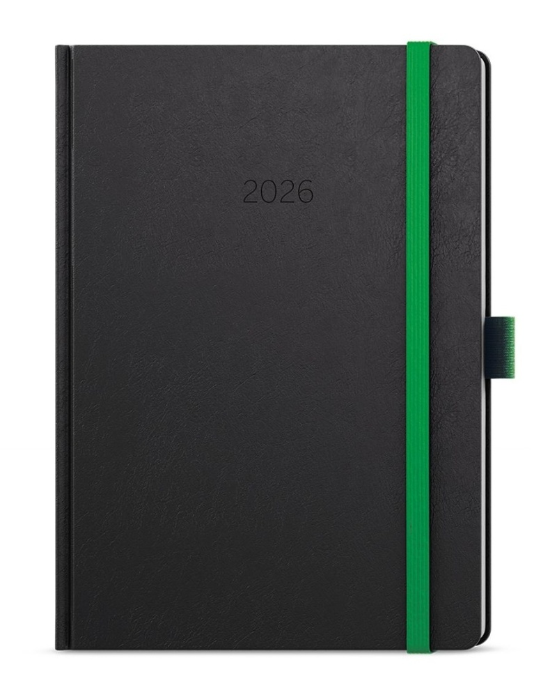 Neobyčejný denní diář s matným povrchem ze strukturovaného materiálu se zelenou gumičkou a poutkem. Je vyráběný ve formátu A5, má velký prostor pro poznámky a plánování.