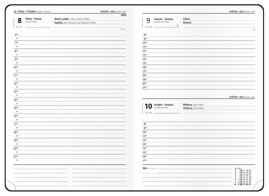 Originální diář A5 má ohebnou vazbu a obal imituje kůži. Díky výseku na tužku ve hřbetu diáře už nikdy nezapomenete na propisku, a tak se diář stane skvělým parťákem pro Vaše plánování.