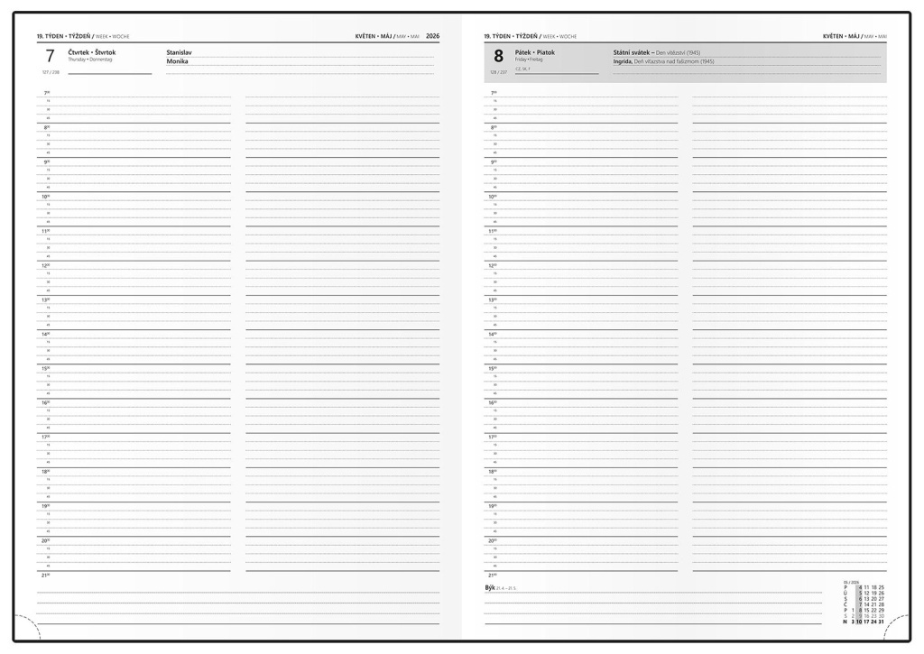 Denní diář ve formátu A4 v oblíbeném hladkém materiálu vivella. Díky velkému formátu Vám diář poskytne velký prostor pro každodenní plánování.