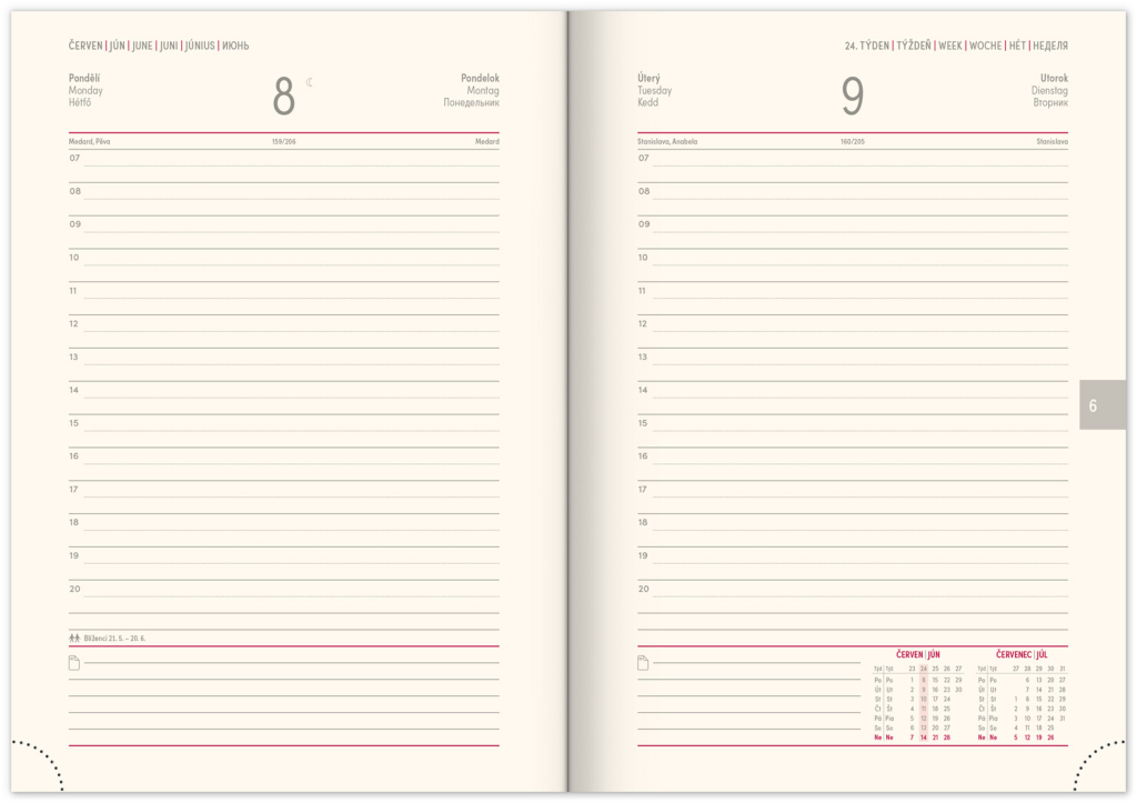 Nová řada diářů s výrazným letopočtem. Povrch má jemnou strukturu a je vhodný pro všechny typy ražeb. Denní rozložení s česko-slovenským kalendáriem a doplňkovou angličtinou, němčinou, maďarštinou a ruštinou.