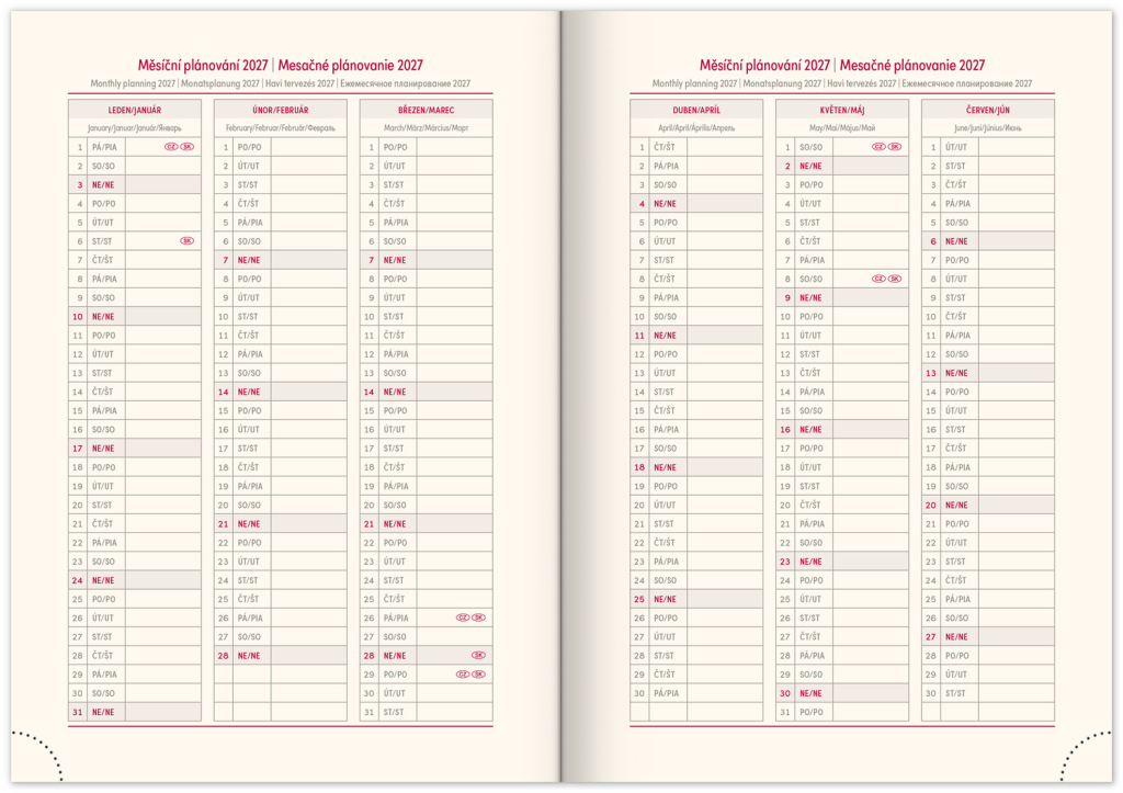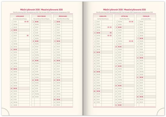 Nová, cenově dostupná řada diářů s obálkou z ekologického papíru spojuje styl a udržitelnost. Denní rozložení s česko-slovenským kalendáriem a doplňkovou angličtinou, němčinou, maďarštinou a ruštinou.