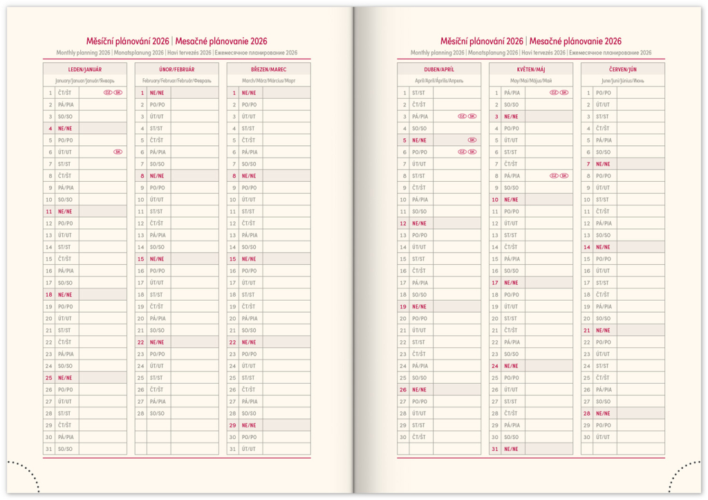 Nová, cenově dostupná řada diářů s obálkou z ekologického papíru spojuje styl a udržitelnost. Denní rozložení s česko-slovenským kalendáriem a doplňkovou angličtinou, němčinou, maďarštinou a ruštinou.