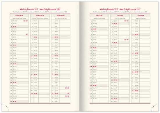 Nová řada diářů v moderním designu doplněném o pevnou gumičku a poutko na pero. Denní rozložení s česko-slovenským kalendáriem a doplňkovou angličtinou, němčinou, maďarštinou a ruštinou. • kalendárium od prosince 2025• měsíční plánovací kalendář 2026 • měsíční plánovací kalendář 2027• roční ...