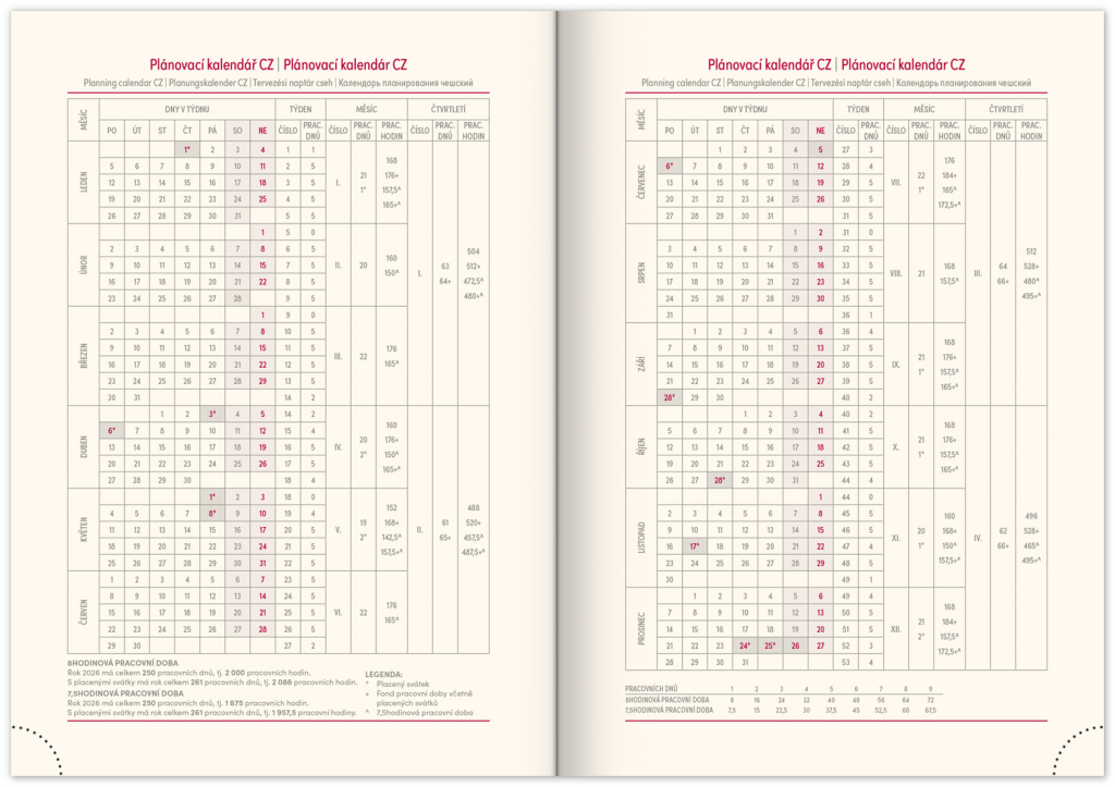 Nová řada diářů v moderním designu doplněném o pevnou gumičku a poutko na pero. Denní rozložení s česko-slovenským kalendáriem a doplňkovou angličtinou, němčinou, maďarštinou a ruštinou. • kalendárium od prosince 2025• roční plánovací kalendář 2026–2027 • pracovní plánovací kalendář • svátky České a ...