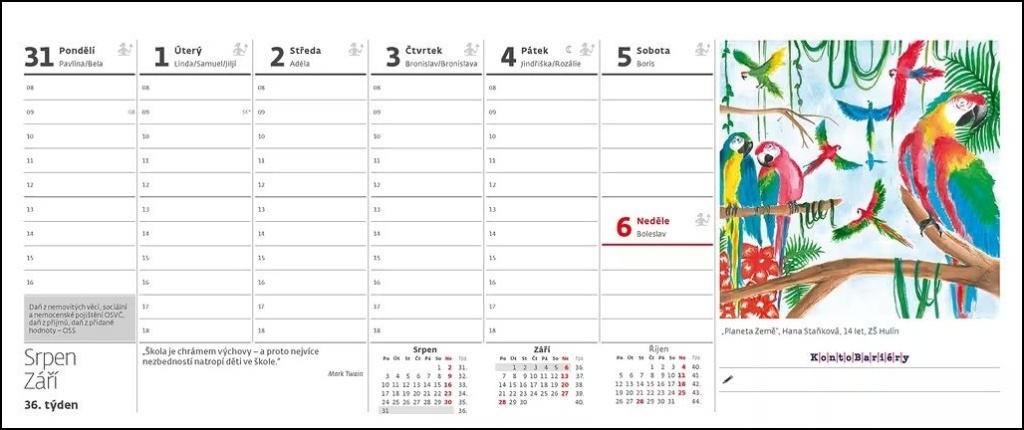 Formát kalendáře: 32,1 x 13,4 cm Kalendárium: české týdenní sloupcové Počet stran kalendáře: 60 + 2 Stojánek: se zámkem Prostor pro přítisk: 32,1 x 3,5 cm + daně, roční období, znamení zvěrokruhu, EU svátky, 3měsíční přehled