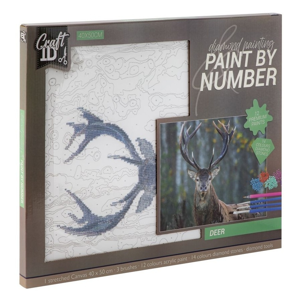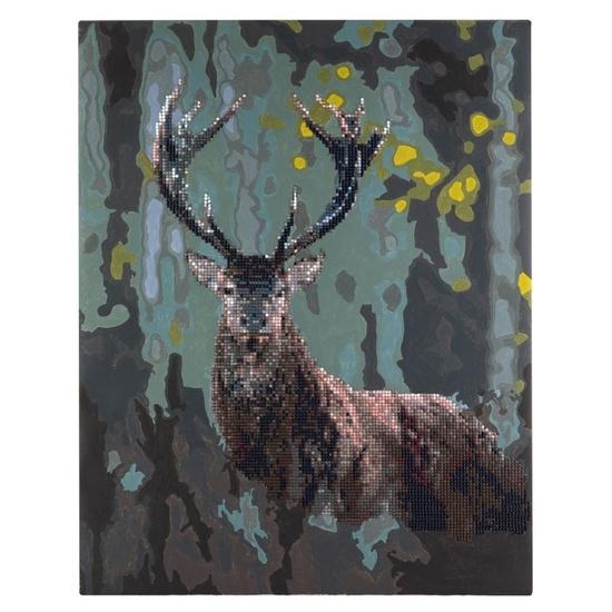 Malování pomocí kamínků Diamond/podle čísel Jelen 40×50 cm. Tento obrázek kombinuje dvě techniky pomocí kamínků a malování podle čísel. Součástí balení vodové barvy, štetec, aplikátor, kamínky a obrázek.
