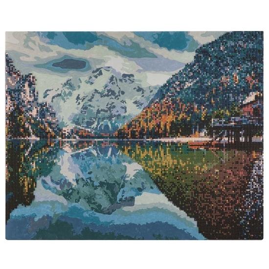 Malování pomocí kamínků Diamond/podle čísel Jezero 40×50 cm. Tento obrázek kombinuje dvě techniky pomocí kamínků a malování podle čísel. Součástí balení vodové barvy, štetec, aplikátor, kamínky a obrázek.