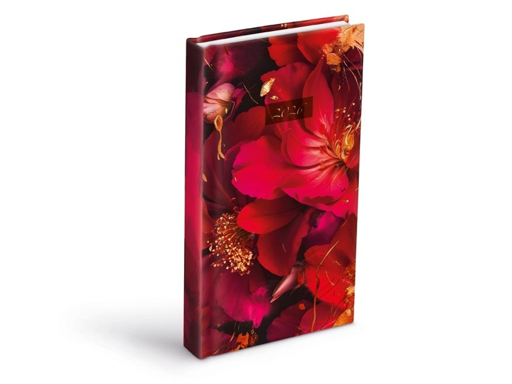 Výrazný vzhled pro výrazný rok! Denní diář 2026 zaujme na první pohled – jeho tmavě červené a vínové květy, doplněné o zlaté detaily, působí jako luxusní látka, která skrývá něco výjimečného. Je odvážný, ale stále vkusný. Elegantní, ale nepřehlédnutelný. Obálka je potažena matným laminem s parciálním lakem, který podtrhuje sytost barev a zároveň zvýrazňuje vybrané detaily lesklým akcentem. Snadno ho vezmete kamkoliv – díky kompaktní velikosti se vejde i do té nejmenší kabelky. Odtrhávací rožky se postarají o to, abyste vždy našli správnou stránku.