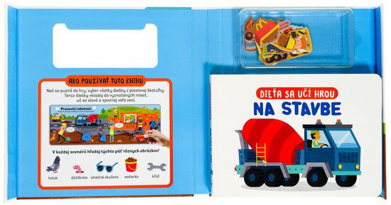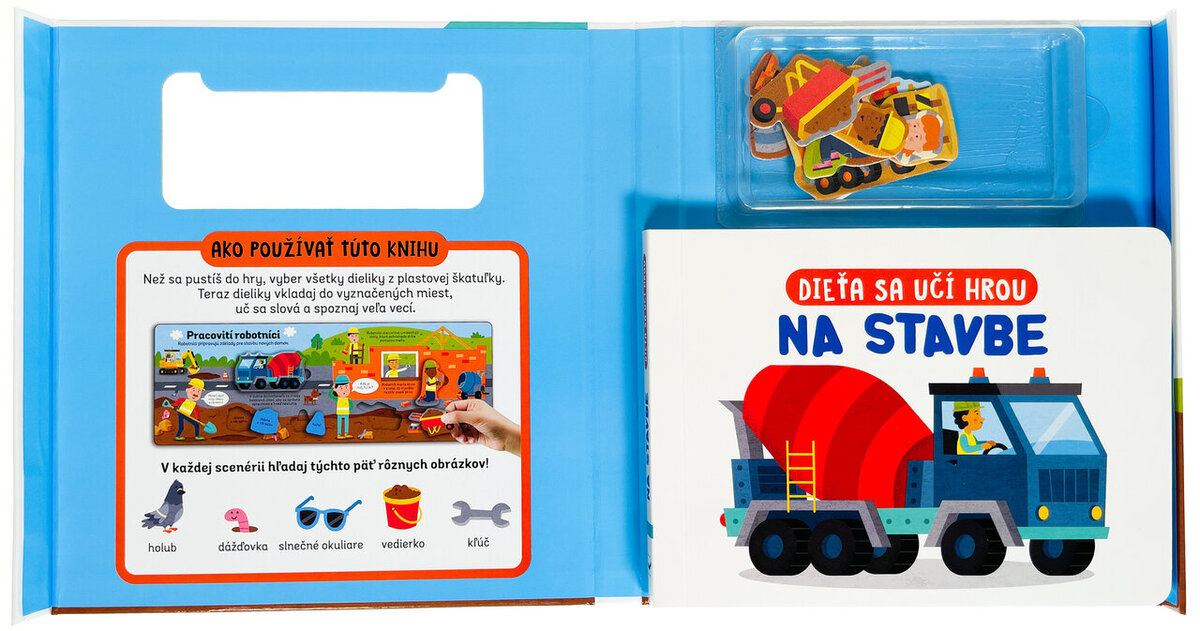 Vyberte si z plastovej škatuľky, ktorá je súčasťou knihy, všetky dieliky a postupne ich vkladajte na správne miesta. Dielik aj vyznačené miesto majú popis, takže sa deti môžu zoznámiť aj s prvými slovami s tematikou stavby. Táto veselo ilustrovaná knižka deti zoznámi so staveniskom, strojmi a rôznym náradím. Na každej dvojstrane môžu deti zároveň hľadať vždy päť obrázkov a precvičovať si tak pozornosť a sústredenie. S knižkou aj dielikmi sa deti rozhodne nudiť nebudú a strávia s nimi celé hodiny staviteľskej zábavy, kedy budú spoznávať okolitý svet, precvičovať jemnú motoriku a pozornosť.