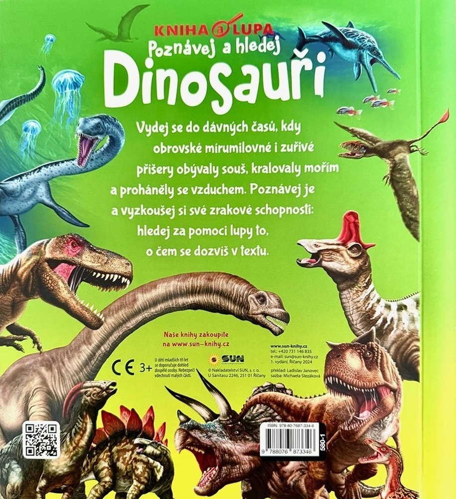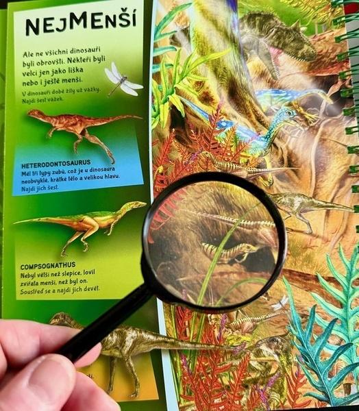 Poznej a najdi na obrázcích dinosaury, kteří žili na zemi, kteří létali i ty kteří žili pod vodou. Dívej se, hledej a poznávej! Vydej se do dávných časů, kdy obrovské mírumilovné i zuřivé příšery obývali souš, kralovali mořím a proháněli se vzduchem. Poznávej je a vyzkoušej si své zrakové schopnosti. Hledej v obrázcích, i za pomoci lupy, to o čem si přečtěš v knize.