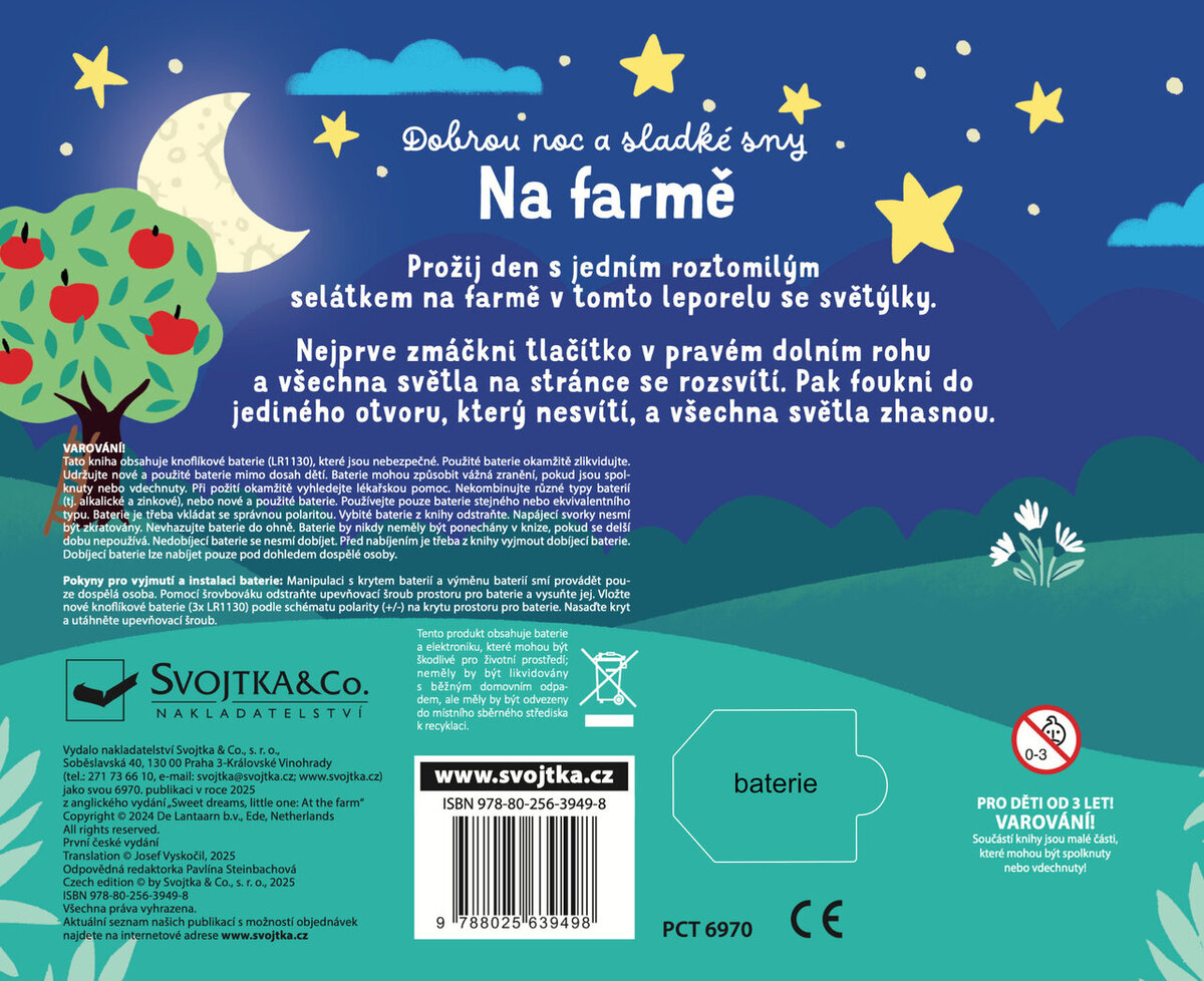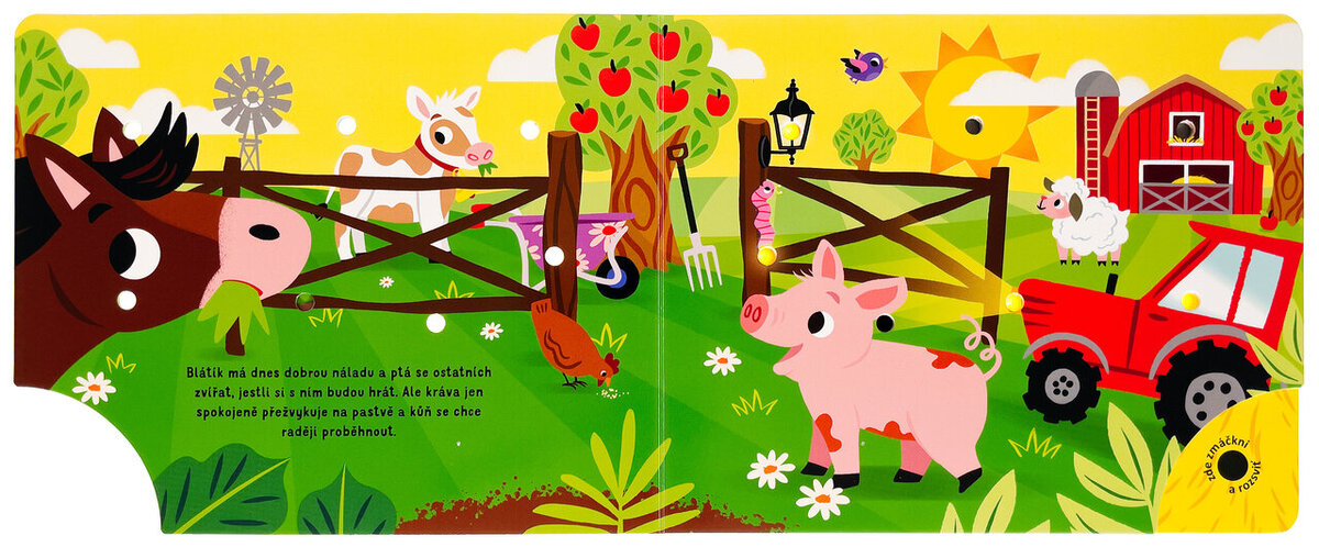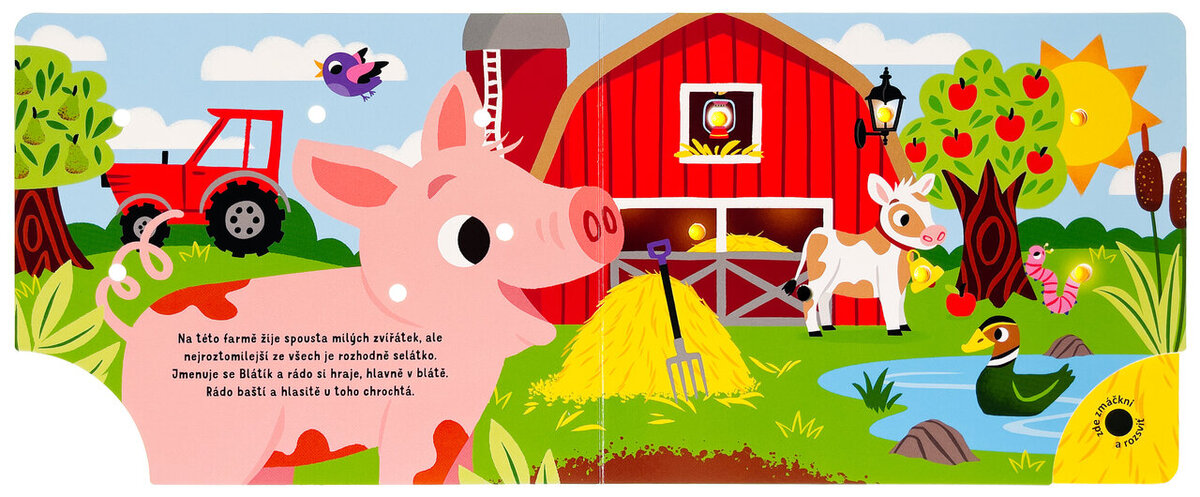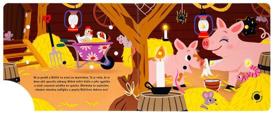 Prožijte den s jedním roztomilým selátkem na farmě v tomto leporelu se světýlky. Selátko si rádo hraje s ostatními zvířaty, ale po celém dni je unavené. Ulož ho do postýlky a fouknutím zhasni světýlka. Jak kniha funguje? Nejprve zmáčkni tlačítko v pravém dolním rohu a všechna světla na stránce se rozsvítí. Pak foukni do jediného otvoru, který nesvítí, a všechna světla zhasnou. Ideální knížka před spaním.