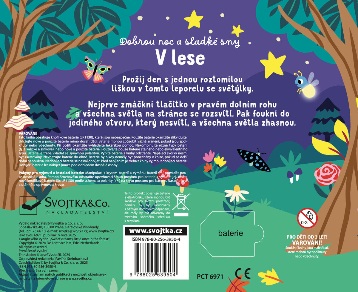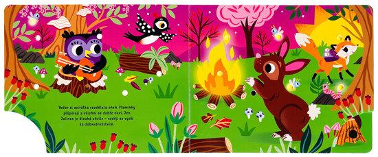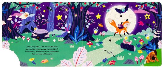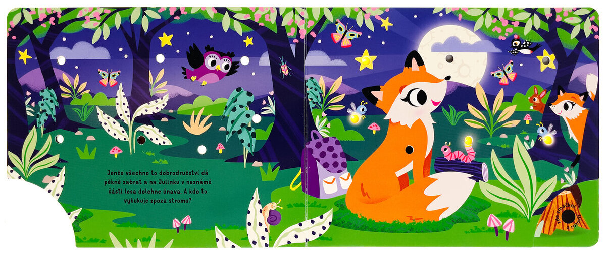 Prožijte den s jednou roztomilou liškou v tomto leporelu se světýlky. Malá liška Julinka se vydává na noční dobrodružství lesem, ale pak na ni dolehne únava. Ulož ji do postýlky v liščí noře a fouknutím zhasni světýlka. Jak kniha funguje? Nejprve zmáčkni tlačítko v pravém dolním rohu a všechna světla na stránce se rozsvítí. Pak foukni do jediného otvoru, který nesvítí, a všechna světla zhasnou. Ideální knížka před spaním.