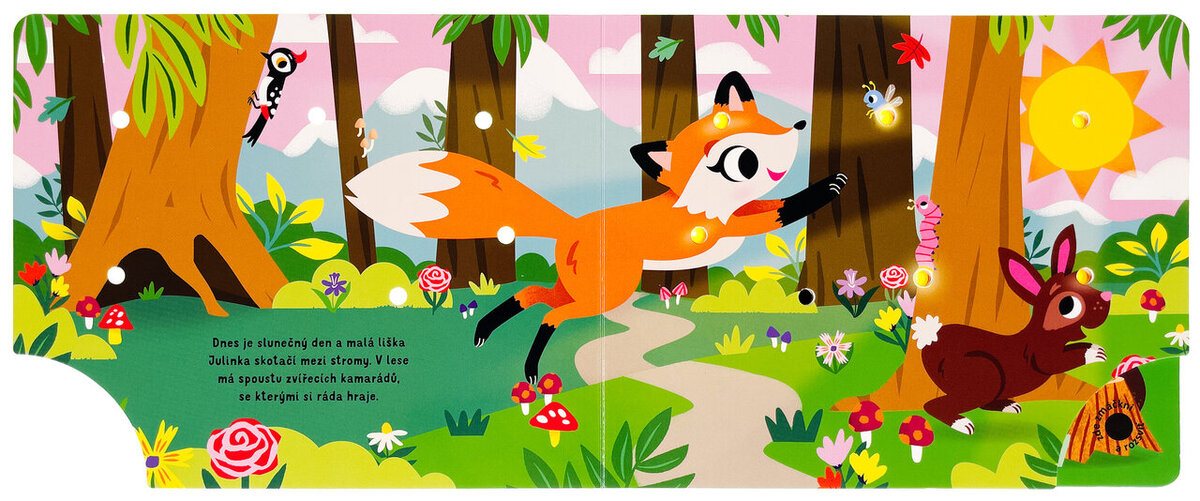 Prožijte den s jednou roztomilou liškou v tomto leporelu se světýlky. Malá liška Julinka se vydává na noční dobrodružství lesem, ale pak na ni dolehne únava. Ulož ji do postýlky v liščí noře a fouknutím zhasni světýlka. Jak kniha funguje? Nejprve zmáčkni tlačítko v pravém dolním rohu a všechna ...