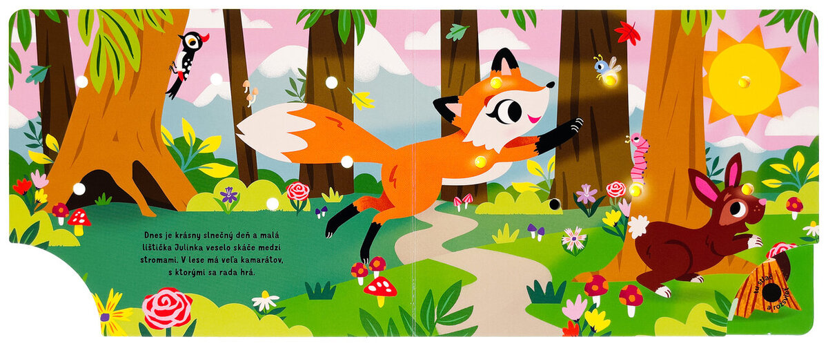Prežite deň s jednou roztomilou líškou v tomto leporele so svetielkami. Malá líška Julinka sa vydáva na nočné dobrodružstvo lesom, ale zrazu na ňu doľahne únava. Ulož ju do postieľky v líščej nore a fúknutím zhasni svetielka. Ako kniha funguje? Najprv stlač tlačidlo v pravom dolnom rohu a všetky ...