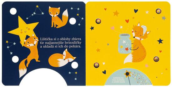 Stačí jemne zafúkať na snímač v dolnej časti knihy a rozžiaria sa kúzelné svetielka! Najmenšie deti sprevádza večerom líštička, medvedík, ovečka a zajačik, ktorí sa starajú o hviezdy na nočnej oblohe. Krátke nežné texty a svetelné efekty vytvárajú pokojnú atmosféru a podporujú spoločné čítanie pred spaním. Knižka rozvíja predstavivosť, podporuje spoločné čítanie a vďaka interaktívnemu prvku "fúkni a rozsvieť" prináša deťom radosť z objavovania aj pocit malého kúzla. Ideálny večerný rituál pre tie najsladšie sny.