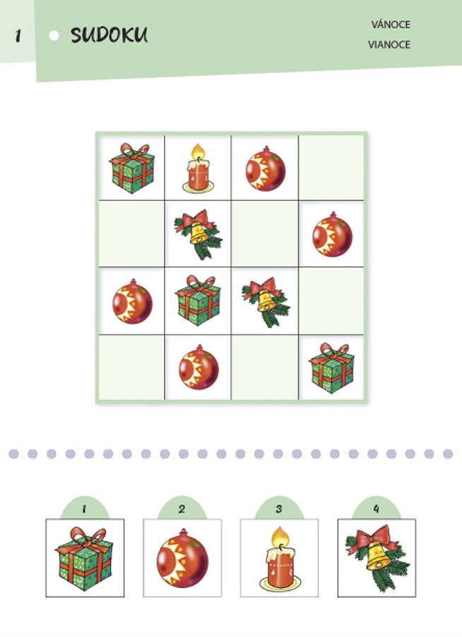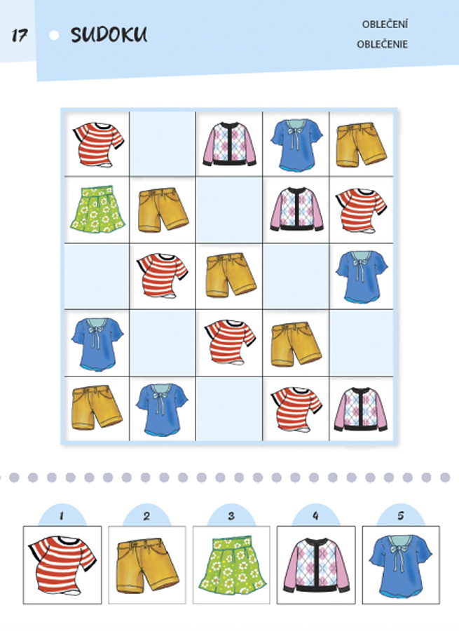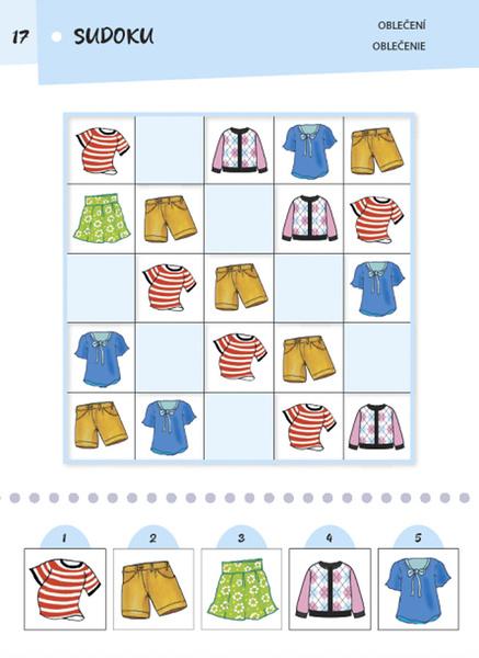 Cílem hry SUDOKU je doplnit samolepky do prázdných políček tak, aby se každý obrázek nacházel v každém sloupci i řádku jedenkrát. Sešit obsahuje SUDOKU, SAMOLEPKY a další AKTIVITY pro zábavu.