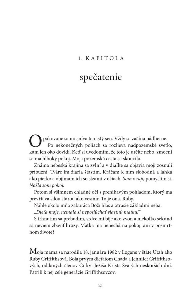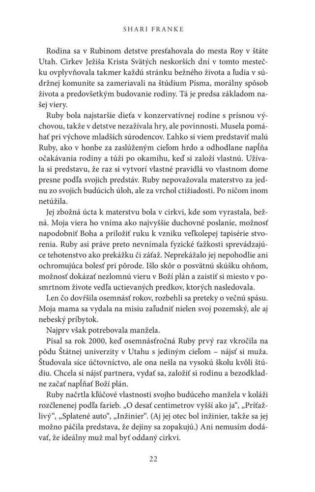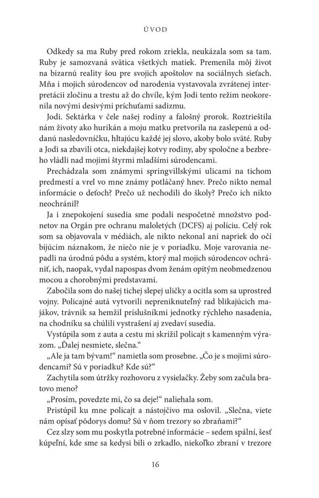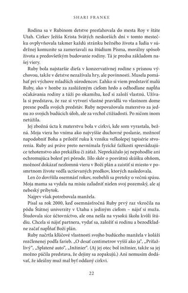 Shari Frankeová rozpráva o výchove plnej trestov a manipulácie, o krutom režime, ktorý sa tváril ako mormonská viera. Matka sa viac starala o svoju online povesť než o potreby vlastných detí a otec svojej manželke zaslepene prikyvoval. Shari nakoniec našla odvahu povedať dosť a priznať pred svetom pravdu.