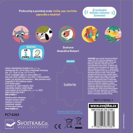 Zmáčkni zvukové tlačítko a poslechni si pět různých zvuků domácích mazlíčků: štěkot psa, mňoukání kočky i zpěv kanárka. Toto zvukové leporelo rozvíjí sluch a hmat a obsahuje krásně barevné ilustrace s jednoduchými popisky. Na konci se mohou děti podívat na fotografie, které ukazují, jak daná zvířata vypadají ve skutečnosti. Poznávejte spolu domácí mazlíčky!
