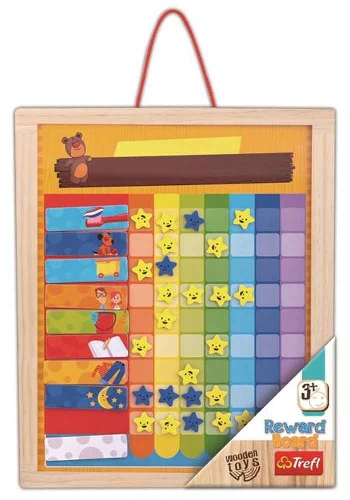 Dřevěná tabulka pro nejmenší od výrobce Trefl z řady dřevěných hraček, které podporují rozvoj dítěte. Motivační tabulka je vyrobena z magnetu, kvalitního dřeva a je barvena netoxickými barvami. Tabulka je oboustranná. Z jedné strany se nachází bílá omyvatelná plocha, na kterou je možno psát přiloženou černou fixou a pomocí "mazátka" (které je umístěno na vršku fixy) je zase možno bílou tabuli mazat. Z druhé strany se nachází barevně uspořádaný týdenní rozvrh. Rodiče mohou díky přiloženým magnetkám, na kterých jsou znázorněny jakékoliv domácí práce či další povinnosti, rozvrhnout svým dětem jejich úkoly. Dítě za splněný úkol dostane magnetku ve tvaru žluté usměvavé hvězdičky. Naopak, když úkol nesplní dostane modrou zamračenou hvězdičku. Tato motivační tabulka hravě učí děti plnit jejich povinnosti a úkoly. Motivuje děti k tomu, aby dostávali jen žluté hvězdičky a ony s radostí budou plnit rozvrh, který jim rodiče naplánovali. Díky výrobku se děti naučí plnit si své povinnosti a úkoly. Vhodné pro děti od 3 let.