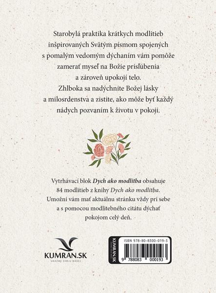 Vytrhávací blok Dych ako modlitba obsahuje 84 modlitieb z knihy Dych ako modlitba. Umožní vám mať aktuálnu stránku vždy pri sebe a s pomocou modlitebného citátu dýchať pokojom celý deň.