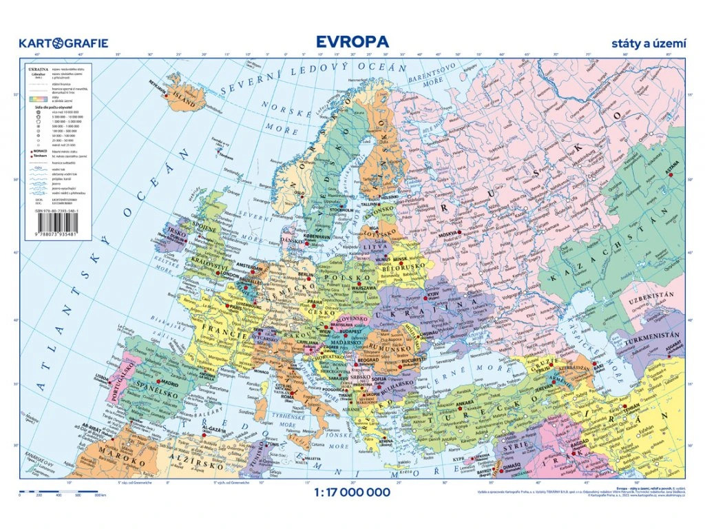 Oblíbená oboustranná mapa našeho světadílu vám na jedné straně poskytne celkový přehled o státech, hlavních a ostatních významných městech Evropy a jejího blízkého okolí, na druhé straně pak podá informace evropském reliéfu – významných nížinách, plošinách, horstvech, významných vrcholech, o řekách a jezerech a stejně tak o Evropu obklopujících mořích a zálivech.